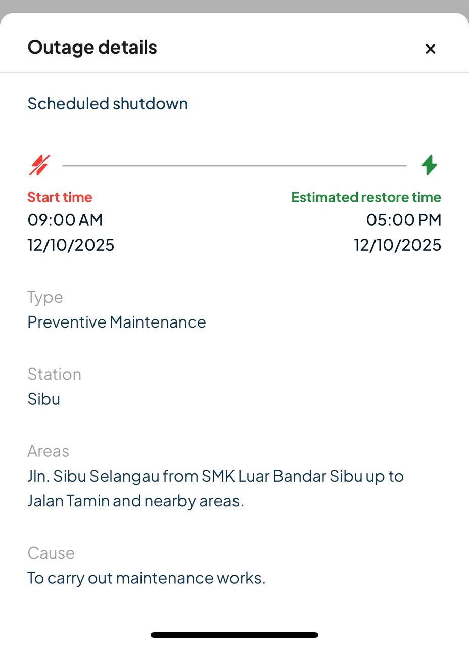 Gangguan Bekalan Elektrik pada 12 Oktober 2025 bermula dari jam 9 pagi sehingga 5 petang.